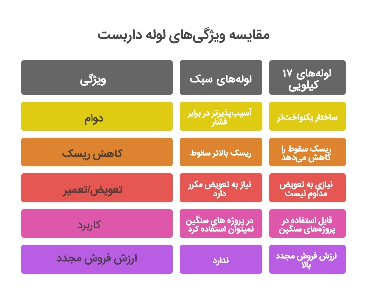 یکی از دلایل محبوبیت این لوله میان پیمانکاران باتجربه، پایداری و ثبات آن در شرایط سخت کاری است. برخلاف لولههای سبکتر که در برابر فشار، خمشدگی یا شکستگی آسیبپذیرترند، لولههای ۱۷ کیلویی ساختار یکنواختتری دارند و طول عمر بالاتری ارائه میدهند.